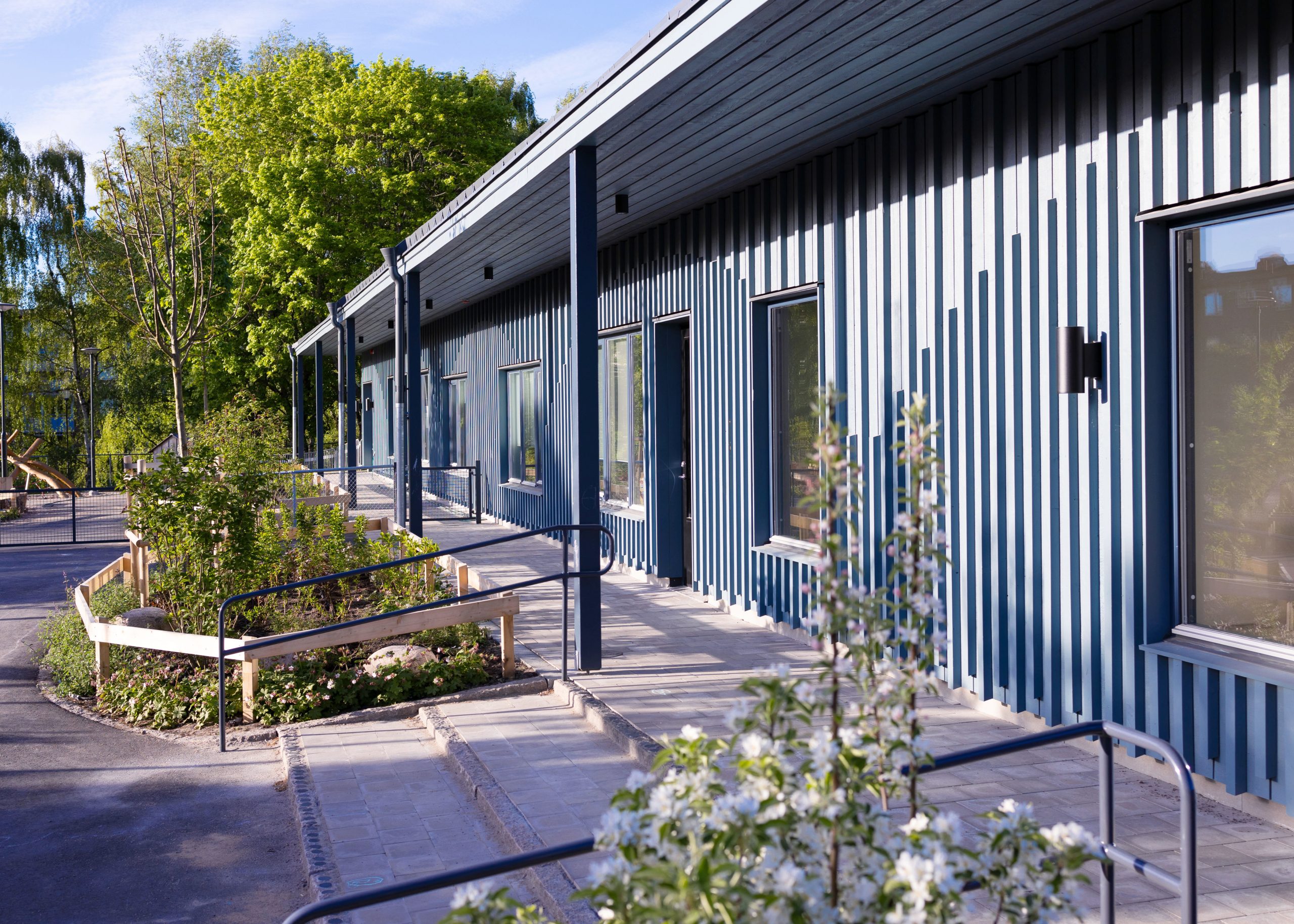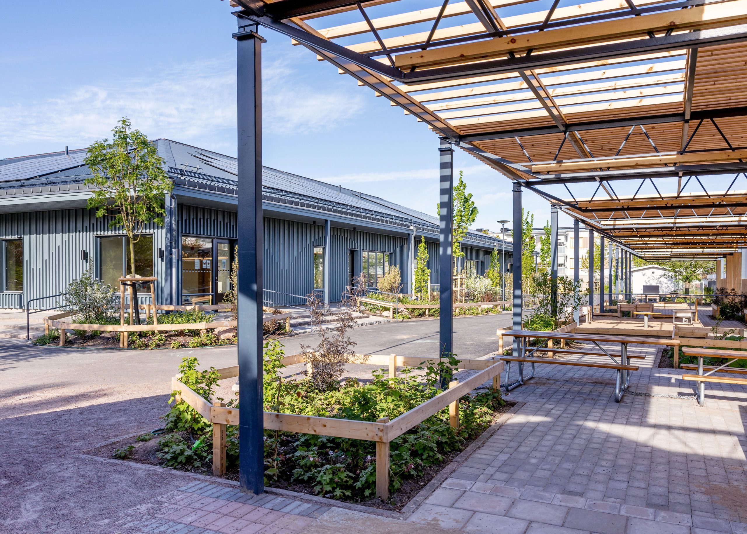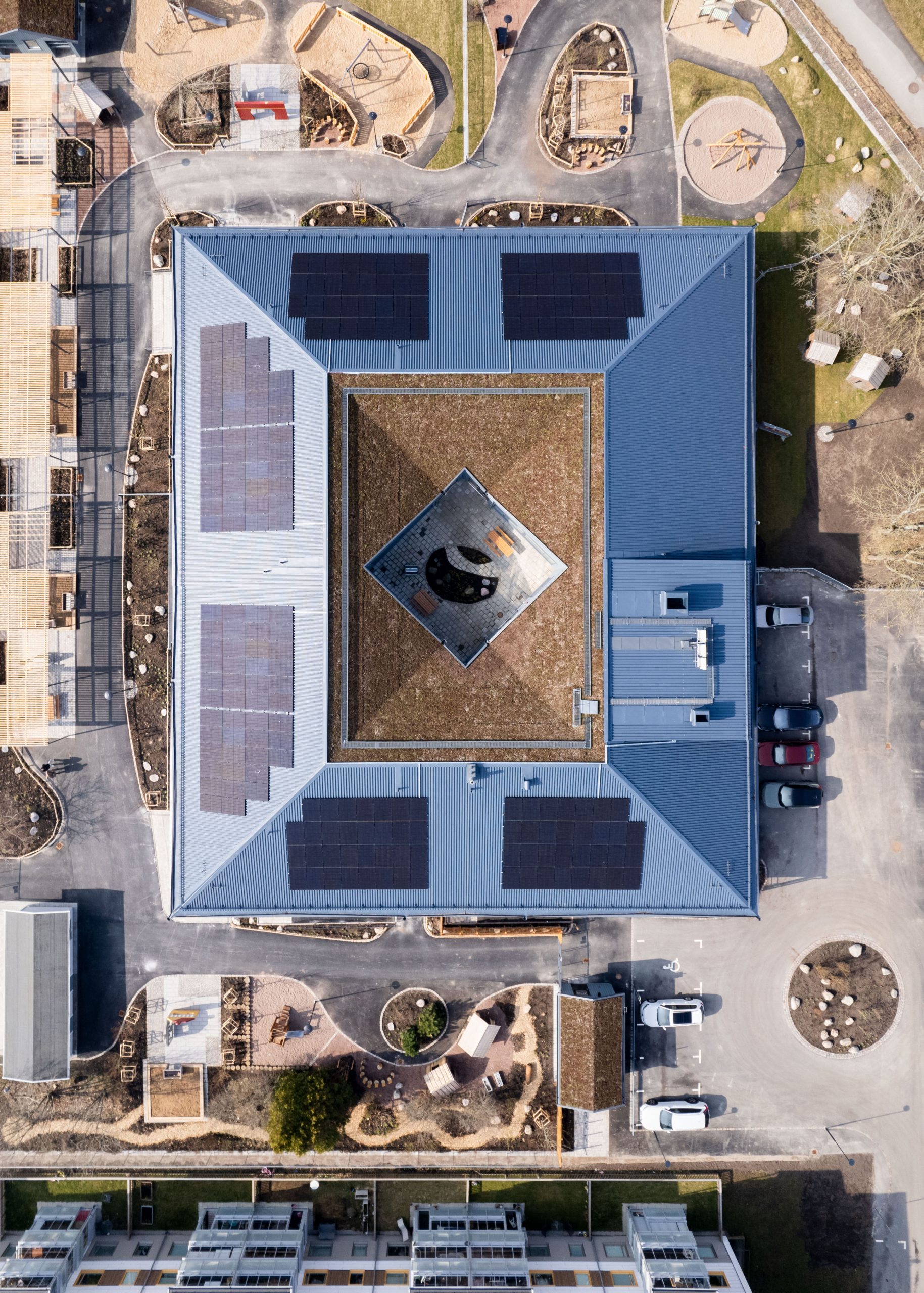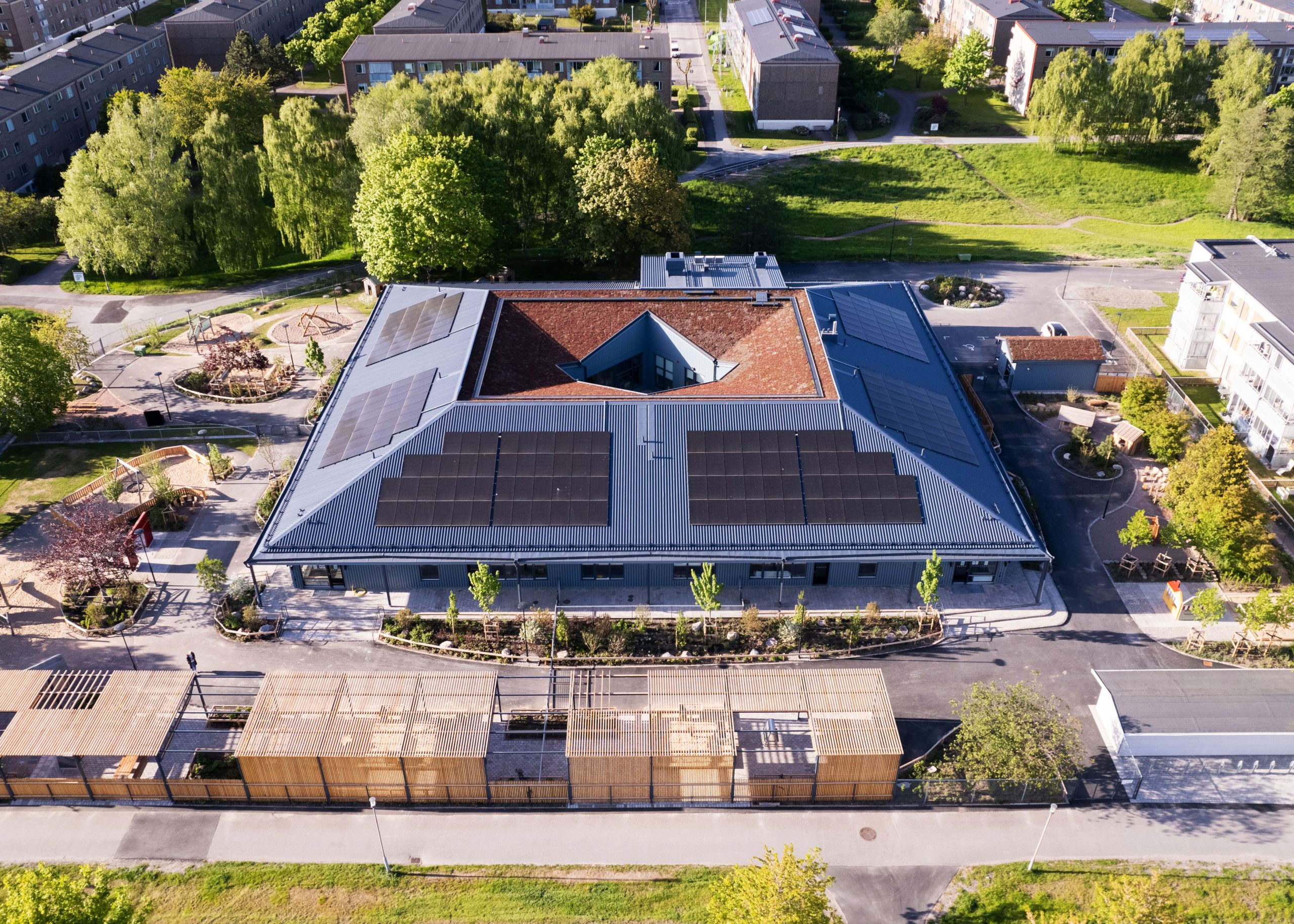 En av de mest betydande klimatvinsterna i projektet är bevarandet av den befintliga bottenplattan från den tidigare byggnaden. Planlösningen har fått anpassas efter befintlig pålning och bottenplattans ytterlinje. Takplåten från den ursprungliga byggnaden har lagats, platsmålats samt försetts med solpaneler. Ett utskjutande tak och en platsbildning närmast fasaden skapar fina skuggiga rum, både inom- och utomhus. Pergolan på skolgården är skapad av återbrukade stålbalkar från den ursprungliga byggnaden.