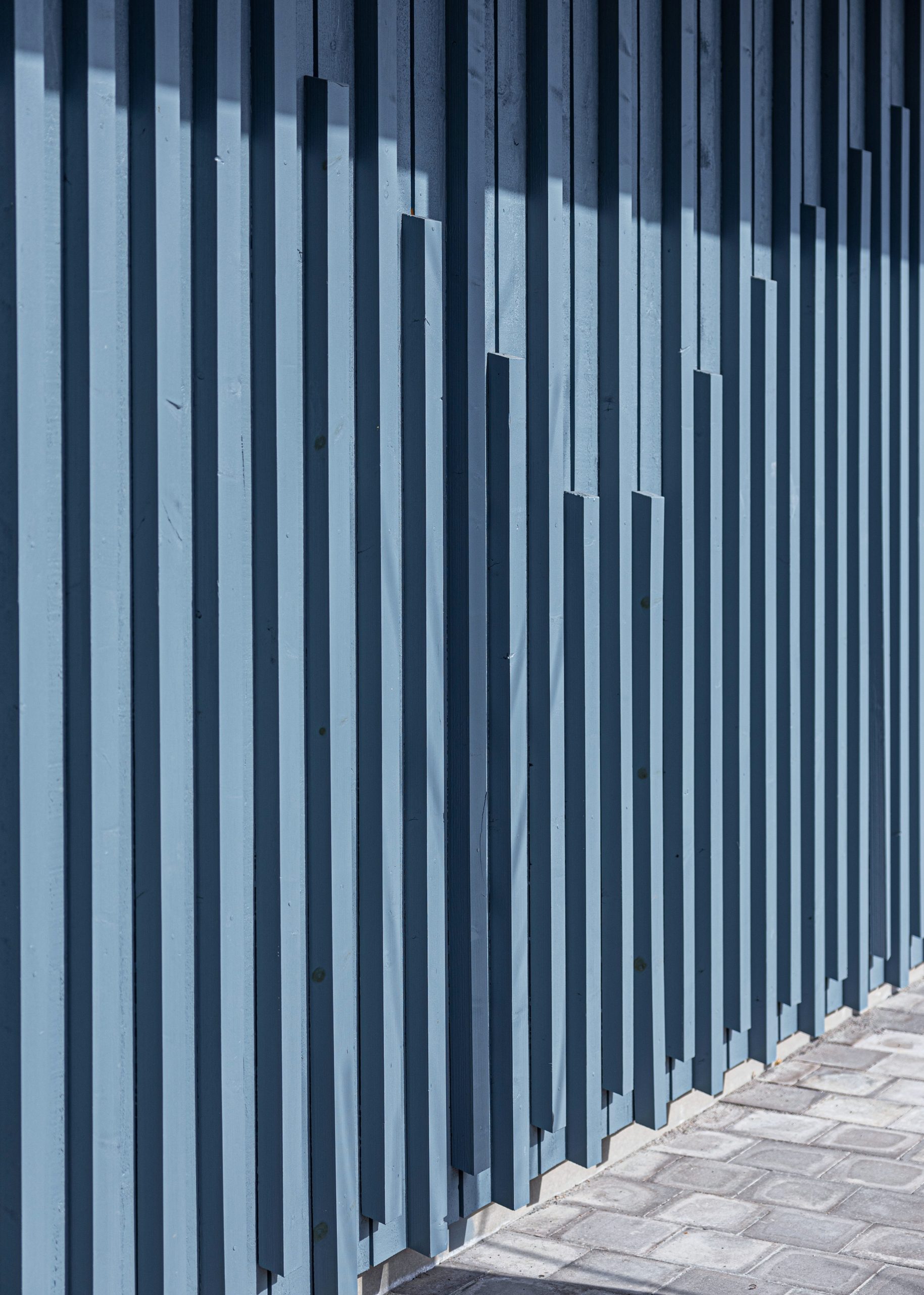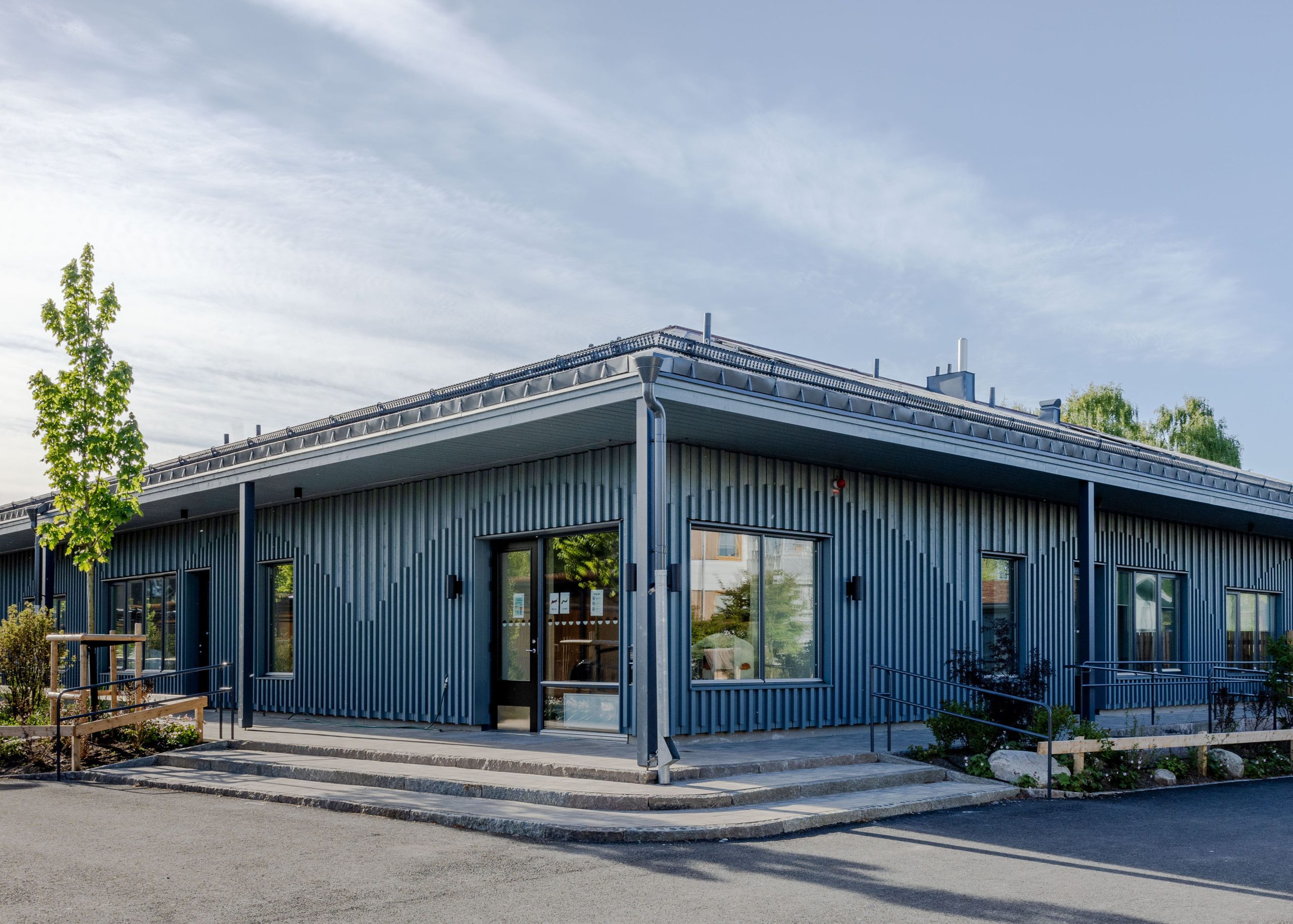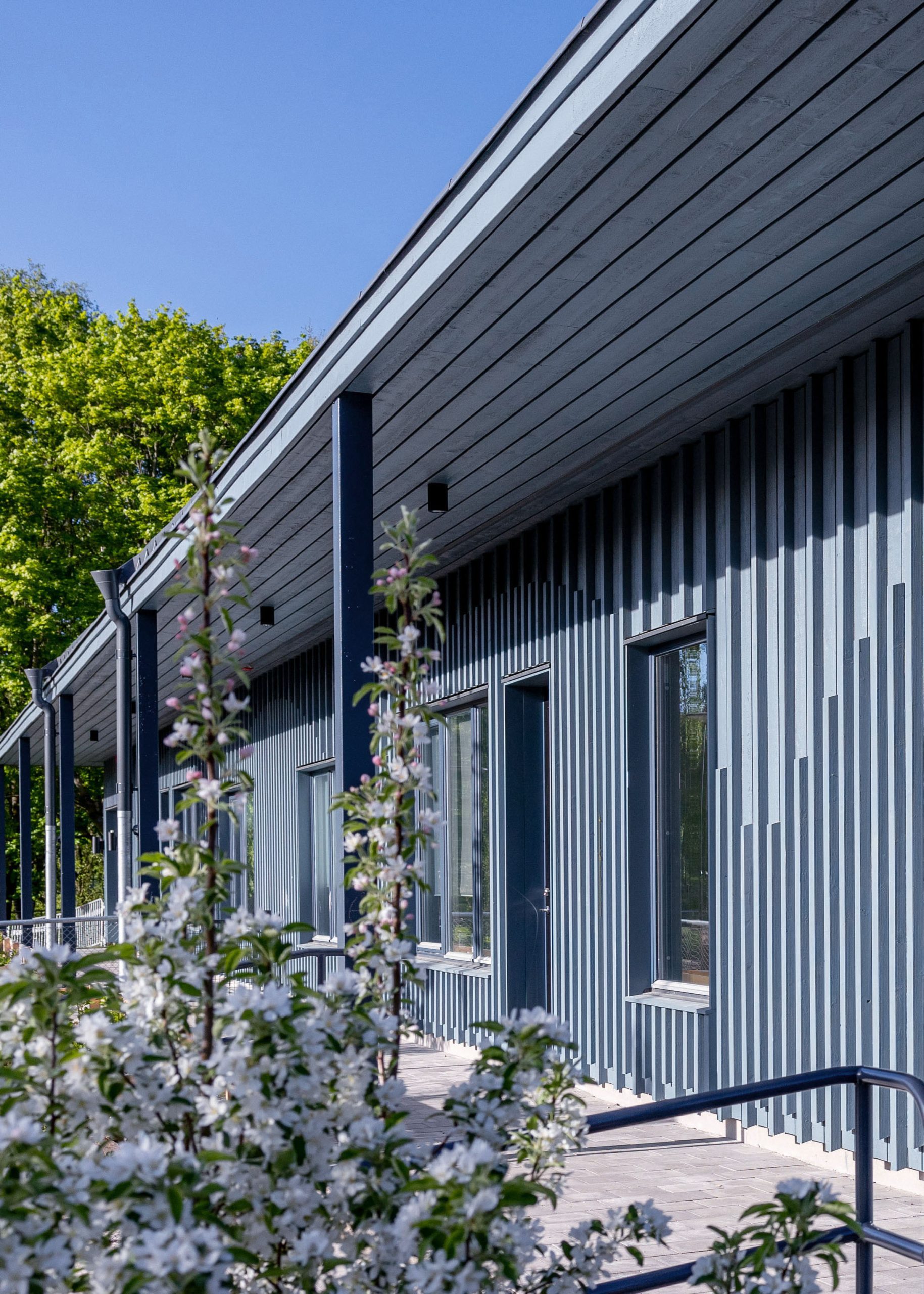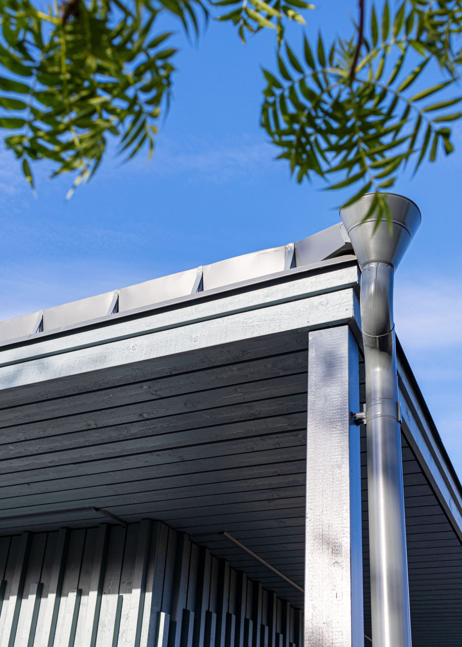 En av de mest betydande klimatvinsterna i projektet är bevarandet av den befintliga bottenplattan från den tidigare byggnaden. Planlösningen har fått anpassas efter befintlig pålning och bottenplattans ytterlinje. Takplåten från den ursprungliga byggnaden har lagats, platsmålats samt försetts med solpaneler. Ett utskjutande tak och en platsbildning närmast fasaden skapar fina skuggiga rum, både inom- och utomhus. Pergolan på skolgården är skapad av återbrukade stålbalkar från den ursprungliga byggnaden.